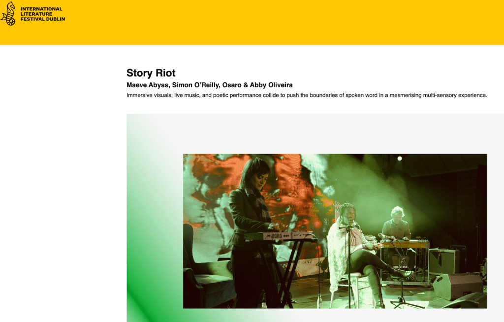 Story Riot blossomed out of Hedge School 2024 on the rugged west coast of Doolin, Ireland. Story Riot seeks to combine ambient music with spoken word and immersive live visuals. Recent performances have been at the Courthouse Gallery in Ennistymon as well as the International Literary Festival, Dublin. Story Riot will be touring this summer of 2024.